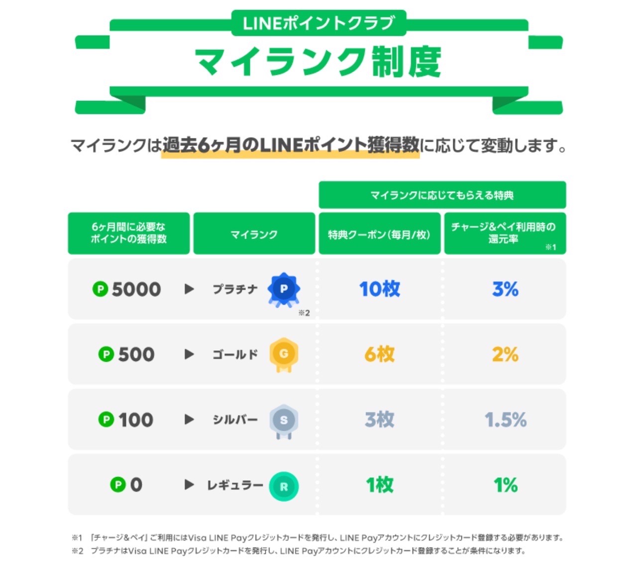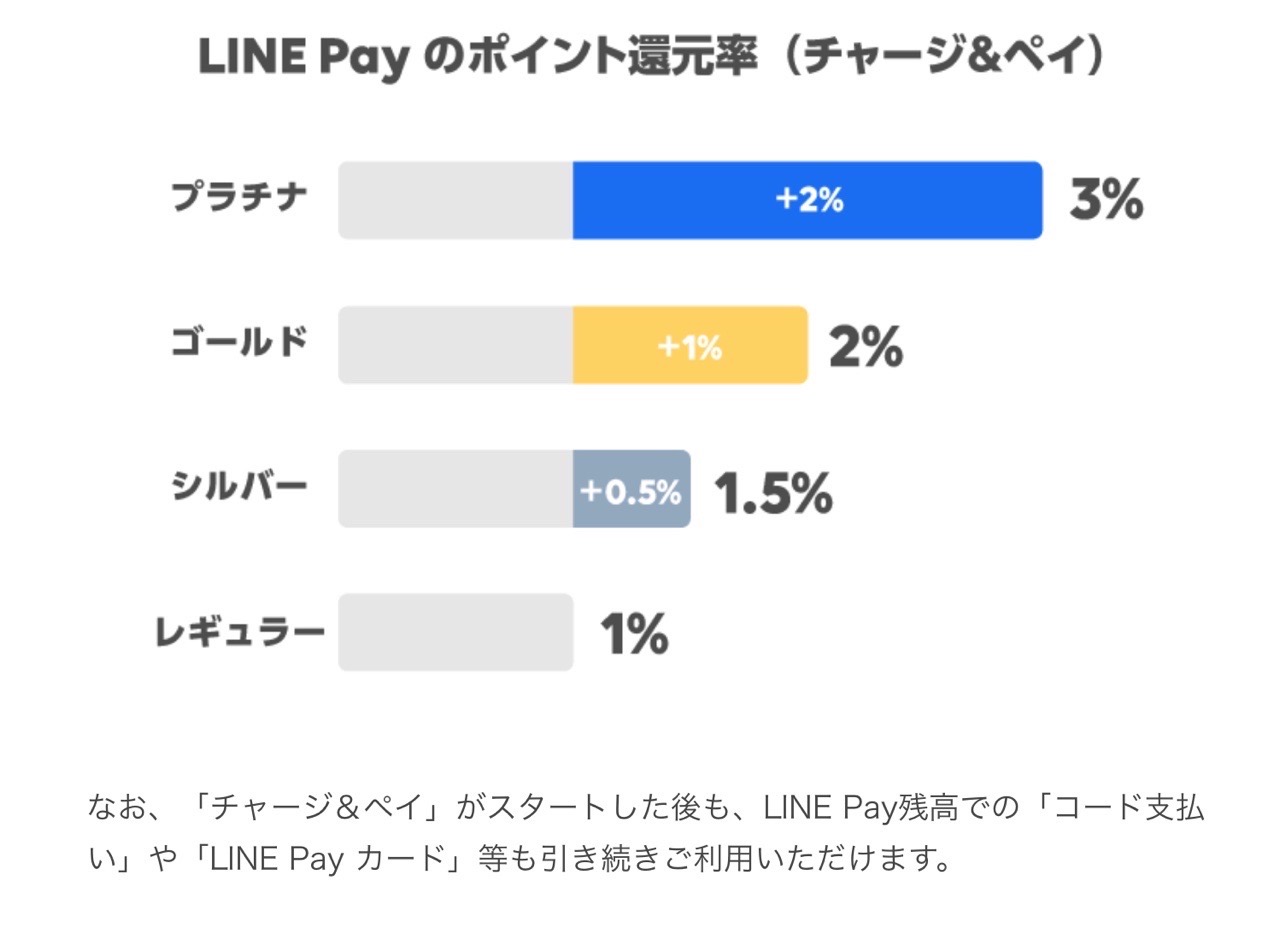 具体的にランクは「レギュラー」「シルバー」「ゴールド」「プラチナ」の4つがあり、還元率は1~3%で変わります。なお、最上位の「プラチナ」になるためには、Visa LINE Payクレジットカードをアカウントに紐づけておく必要があります。