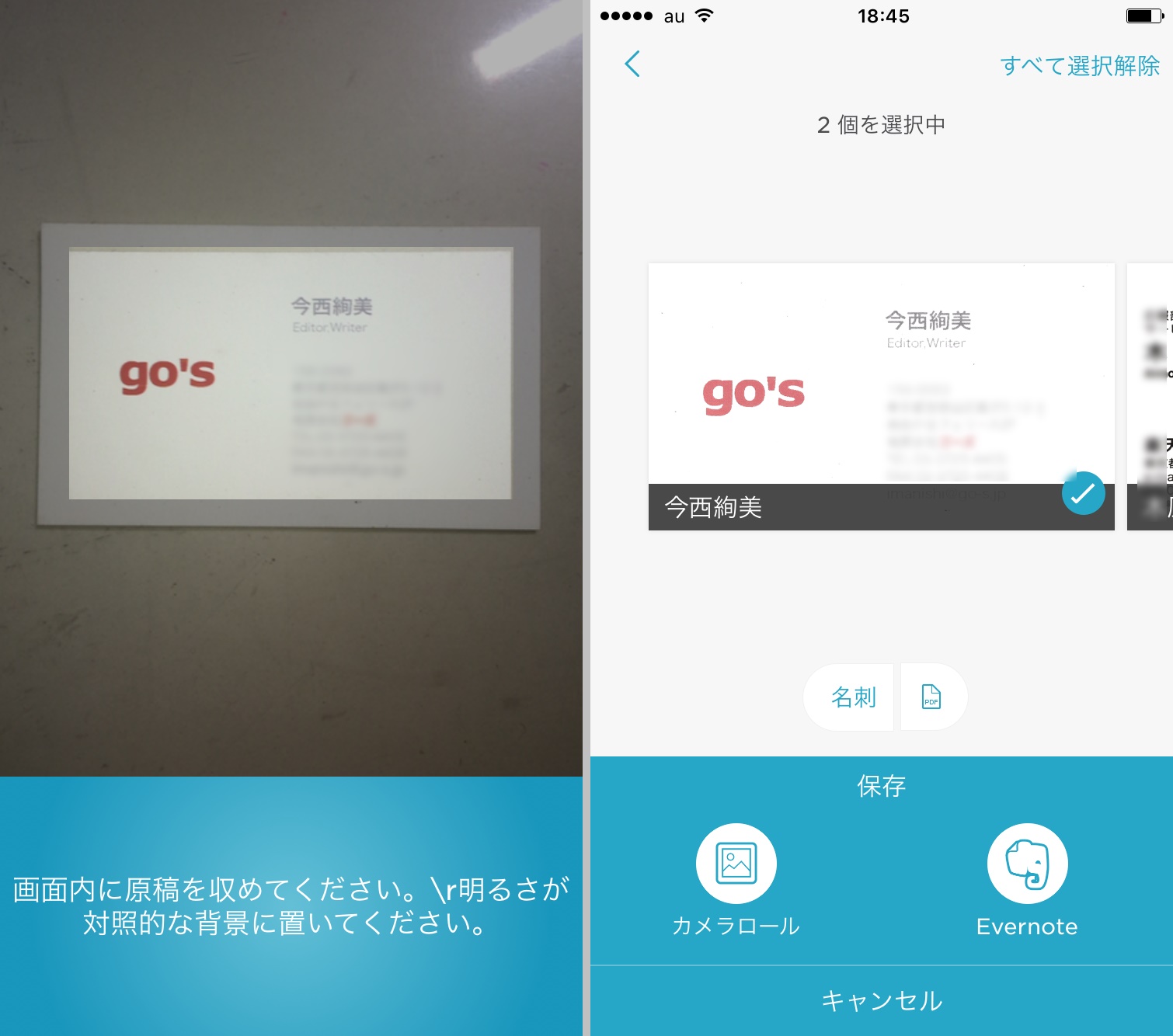 スキャンする書類の形を認識して撮影し、自動的にトリミングや画像補正を行います。名刺の場合は、複数枚の名刺を連続して撮影したあとに、自動的にデータを分割した上で名刺データとしてEvernote上に保存できるのが利点です。