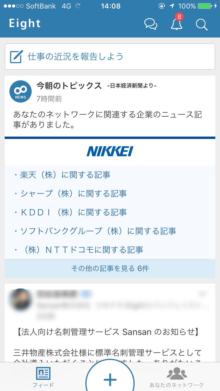 また、ニュースフィード機能があるのもEightならでは。プロフィールの変更などのアップデート情報が配信されるだけでなく、Facebookのように近況を投稿したり、コメントや「いいね!」を付けたりできます。