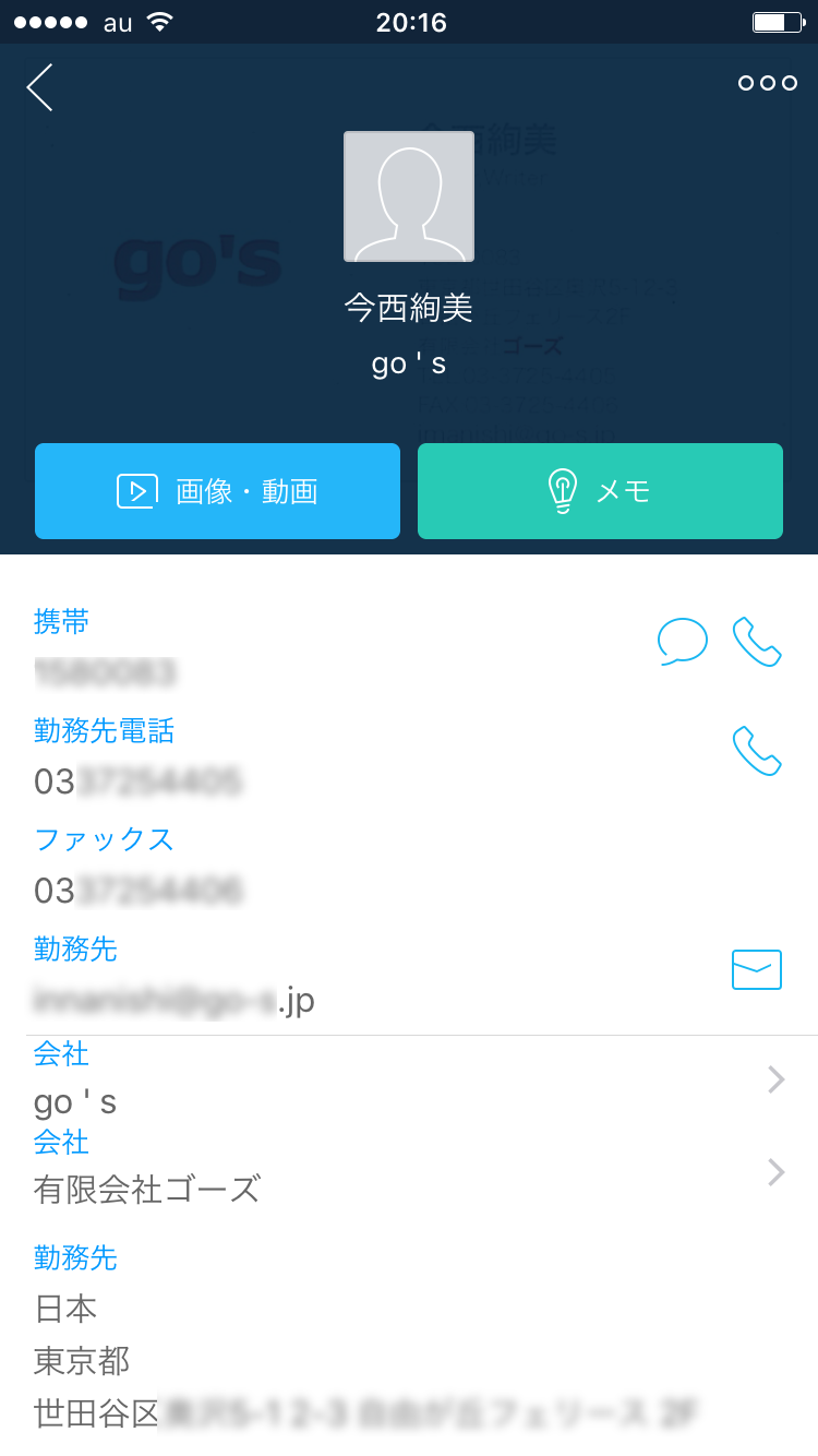 アプリ内のデータから直接電話をかけたり、メールを作成できるだけでなく、勤務先欄には住所に基づいた地図も表示されます。