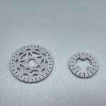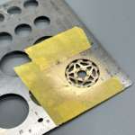 ブレーキディスクの金属感を出すために下地に黒を塗装してからリム部分をシルバーに、ハブ部分をゴールドで塗装します。ただしゴールド(Mr.カラー「C9 ゴールド」)はそのままだとギラギラ感が強すぎるので、シルバーを10%程度混色したカラーで塗装すると良いでしょう。また、ディスクローターのリムとハブはモールド(彫刻)が彫りこまれていますが、塗装を正確かつ円状に塗り分けるのはなかなか大変。そこで、ステンレス製のテンプレートを利用したマスキングをおこない、エアブラシで正確な円の塗り分け行います。