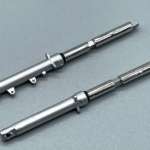 ▲キットのフロントサスペンションはインナーチューブも一体成型されている。塗装前にゲート跡やパーティングラインを丁重に研磨処理しておく