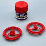足回りの製作は、まず前輪と後輪を組んでいきます。前後ホイールはインスト(説明書)で指定されたMr.カラー「C79 シャインレッド」をエアブラシで塗装。パーツ成型色の白を活かしているので、サーフェイサーによる下地塗装はしていません。シャインレッドの乾燥後に上からクリアー(今回は「ガイアノーツ・Exクリアー」を使用)を重ねて塗装することで光沢を出します。