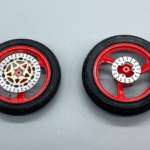 ▲塗装と組み立てが完了した前輪(左)と後輪(右)。タイヤとホイールを組む際にタイヤのトレッドパターンが逆きにならないように気を付ける