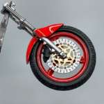 ▲フロントフォークとディスクブレーキを取り付けたホイールにフロントフェンダー等を組み上げて完成したフロントユニット。このあと車体取り付け時にブレーキホース等のパイピングを行う