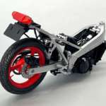 ▲リアタイヤとフロントユニットを車体に仮組みした状態(タイヤ、フロントユニットともにビスで固定)。一気にバイクらしくなってきてモチベーションもアップ!