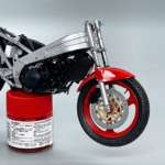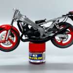 バイクはエンジンはじめ、ブレーキやサスペンションなど、走るためのメカニズムがむき出しになっているのが魅力のひとつ。プラモデルはプラスチックの塊ですが、それが動くようにみえる、オイルに匂いが感じられるようなリアルさを、いかに1/12スケールの中で再現するか、そんな面白さが内包されています。塗装による焼けたエンジンの質感の演出、さらに今回はフィニッシュシートを使ったクロームメッキの再現など、さまざまな塗装テクニック、そしてアイテムを効果的に組み合わせて使うことで、よりリアルな「TZR250」を作り上げていきます。