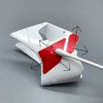 ▲難易度が高いのが燃料タンク。立体裁断されたデカールを曲面で構成されたタンクに貼るわけだが、矢印の部分を事前にカットし、「マークフィット」を使いタンクの曲面にデカールを馴染ませながら、シワが生じないように中央部分、次に左右それぞれを重ね貼りしていく。ドライヤーの温風を使うとより効果的
