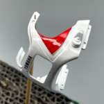 ▲エアブラシ全開でクリアを塗装した状態のフロントカウル。吹き付けたクリアがパーツの表面でじわじわと伸び広がって、均一な光沢仕上げを得られる