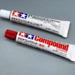 クリアによるオーバーコート塗装を完全に乾燥させたら、さらに塗装面を鏡面仕上げにするため、コンパウンド(研磨剤)を使って塗装面を研ぎあげていきます。今回は、タミヤ製コンパウンドの「粗目」と「仕上げ目」の2種類を使用しました。