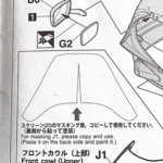 ▲フロントのカウルスクリーンは、インスト(説明書)の原寸大型紙からマスキングシートを切り出して裏側から塗装する