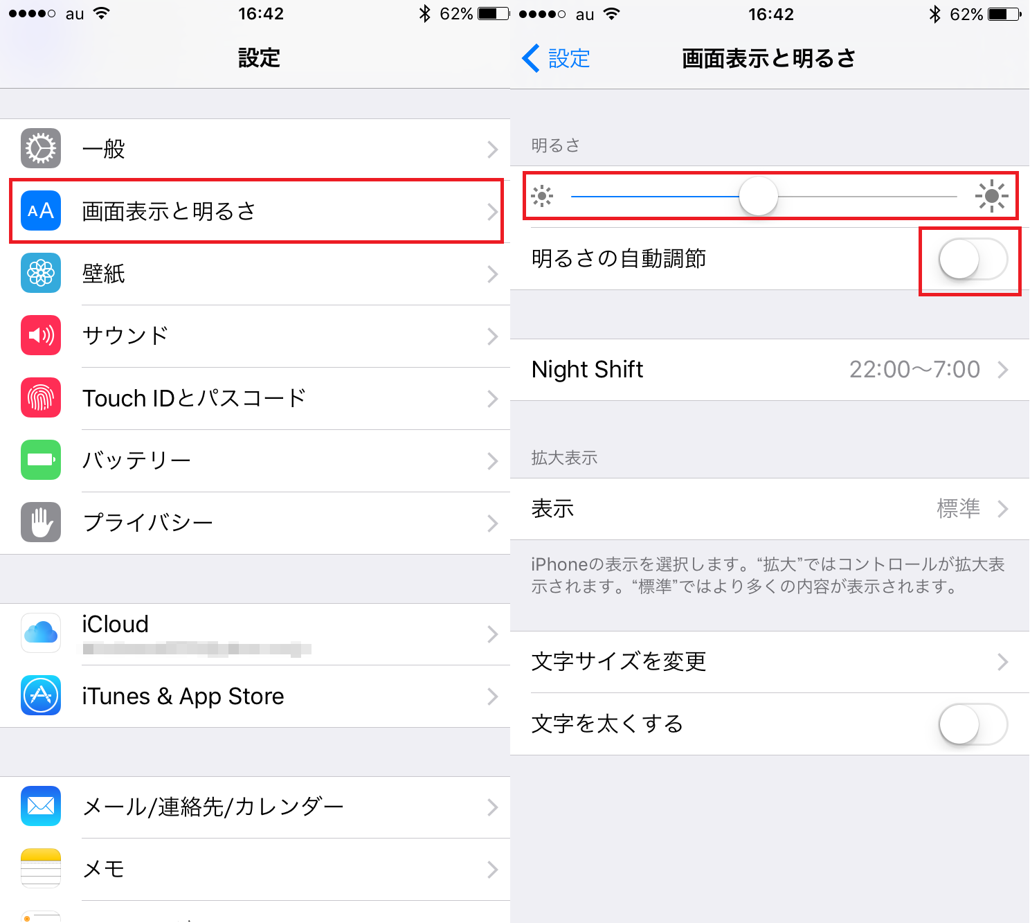 まず、ディスプレイの明るさによって、iPhoneの消費電力に大きな差が出ます。画面の明るさは「設定」アプリの「画面表示と明るさ」から変更することが可能。明るさの自動調節をオフにしておき、なるべく画面を暗く保つことで、バッテリー持ちを長くできます。