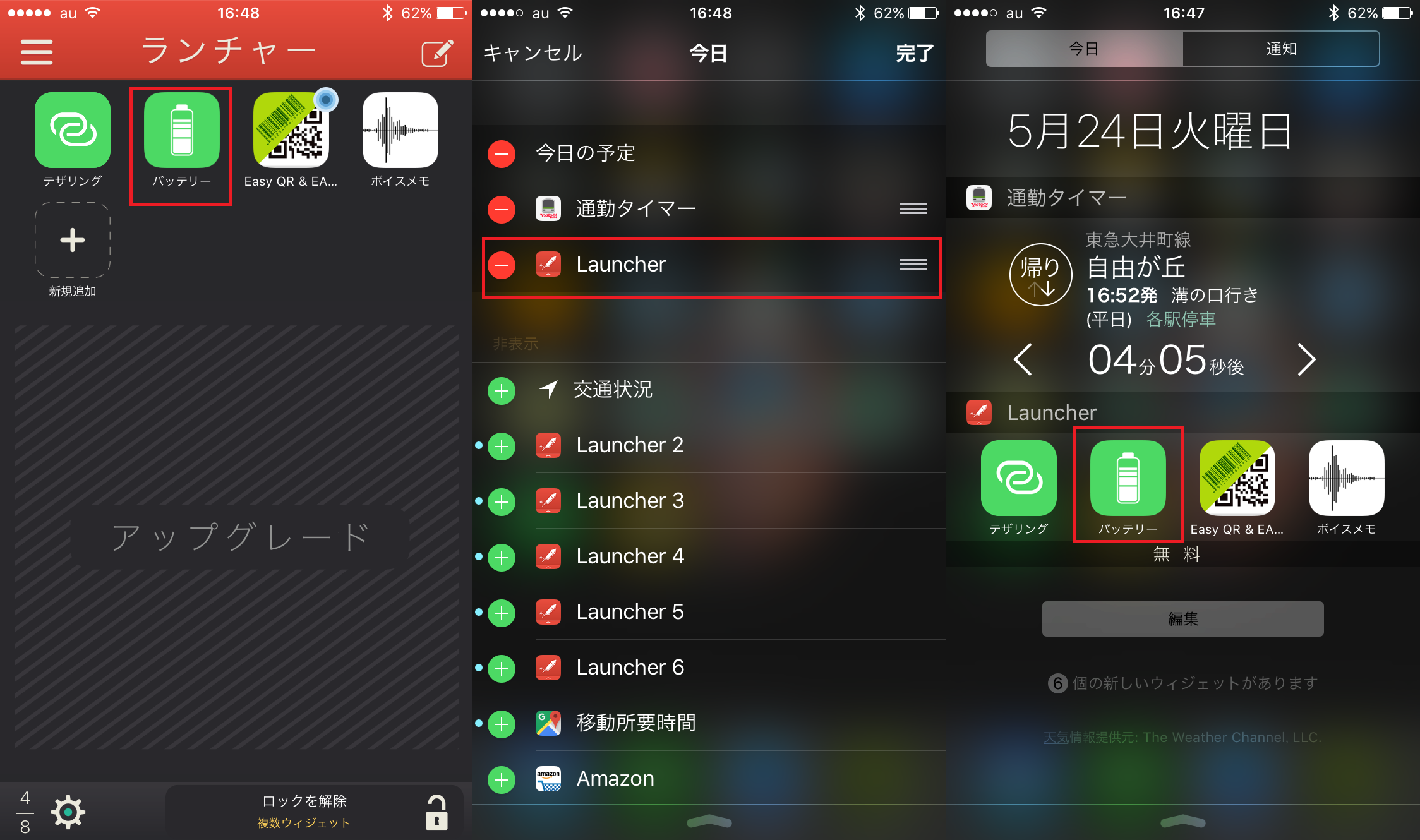 (左)「Launcher」アプリをインストールし、「バッテリー」をショートカットとして登録する (中)iiPhone画面上部を下にスワイプし、「通知センター」を表示して「編集」をタップ。「Launcher」を登録し、ほかの不要なアプリはなるべく登録を外しておく (右)通知センターの「今日」のタブに「バッテリー」へのショートカットが作成された