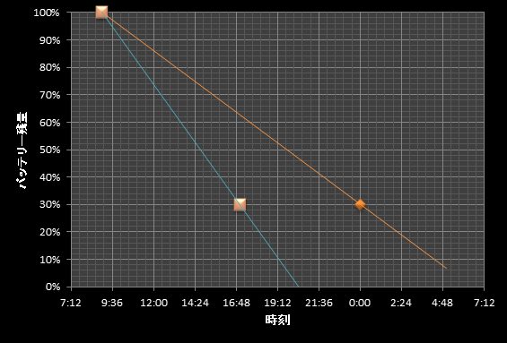 バッテリー残量が30%になった時間を比較。青が通常時、オレンジが低電力モード利用時