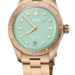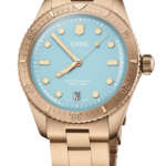 ▲ケース、ベゼル、ブレスレットのすべてにブロンズを用いた「オリス ダイバーズ65 コットンキャンディ」(各31万9000円)。38mmのケース径を採用したユニセックスモデルで、ダイアルは鮮やかかつキュートなキャンディカラーに彩られているのが新しい試み。使用していくに伴い、経年変化したブロンズとダイアルカラーがどのようなマッチングを見せるのかが楽しみだ