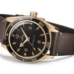 ▲ケース素材に特許申請中の新合金ブロンズゴールドを採用した「シーマスター 300」(136万4000円)。エイジングがゆっくりと進む素材特性もさることながら、新しいシーマスターではスーパールミノバを塗布したベースにアラビア数字インデックスを型抜きしたプレートを重ねた二重構造ダイアルに。しかも、高い精度と1万5000ガウスもの磁場にも耐えるマスター クロノメーターを取得し、往時のルックスを継承しつつも、モダンなタイムピースへとさらなるアップデートを遂げている