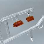 ウインカーやテールランプ類は透明パーツで成型されています。これを「タミヤカラー X-27 クリヤーレッド」と「タミヤカラー X-26 クリヤーオレンジ」で塗装します。塗装は、パーツの裏と表の両面からおこないます。裏側だけ塗装した場合、プラの厚み分奥まった不自然な仕上がりになってしまいます。逆に表側だけの塗装だと、クリア―塗料が凹部分に溜まりやすく、仕上がりにムラができてしまう原因になるため、両面塗装です。また、パーツが小さいので、塗装はランナーにつけたまま行い、乾燥後に切り離します。