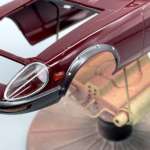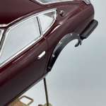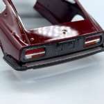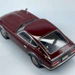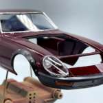 ボディ塗装ですが、今回は缶スプレーを使用してマルーンに仕上げました。一般的なカーモデルのボディ塗装手順では、塗装面のさらなる光沢アップ、デカールの保護等を目的として、ボディカラーの上からクリアーをオーバーコート塗装して仕上げることが多いです。しかし、今回のフェアレディ240ZGではクリアーのオーバーコート塗装をしていませんが、それは何故だと思いますか?
