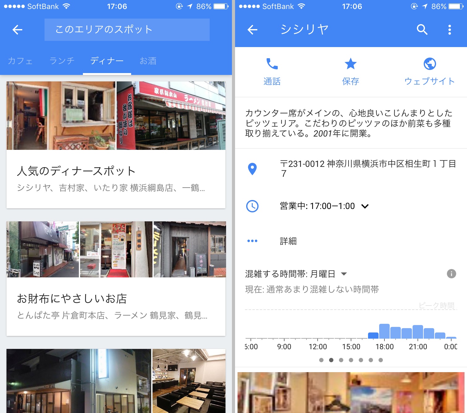 Googleマップには、現在地周辺の飲食店を探す機能もあります。画面下部の「現在値付近の飲食店」をタップすれば、「カフェ」「ランチ」「ディナー」「お酒」の4カテゴリでいろんな飲食店が検索可能です。店舗の営業時間や定休日、混雑する時間帯などもわかるので、いちいち各店舗のホームページで確認する手間も省けます。