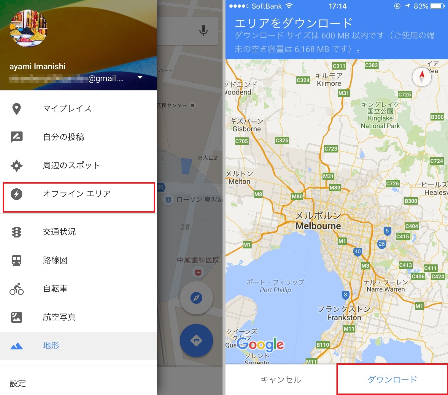 また、メニューリストで「オフラインエリア」を選択すれば。オフライン表示に対応したエリアの地図をダウンロードできます。ただし、日本国内の地図はダウンロード非対応。海外ではダウンロードが可能な場所も多いので、まずはダウンロードしておきたいエリアの地図を表示して確認してみましょう。海外旅行などでインターネットが使えない際も、ダウンロード済みの地図であれば参照できるので便利です。