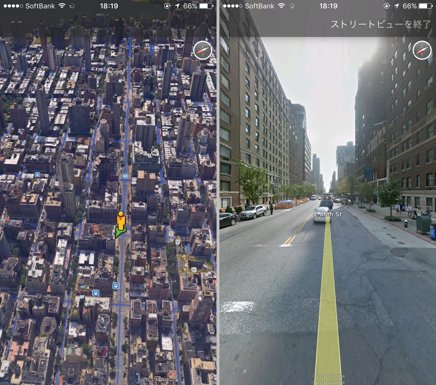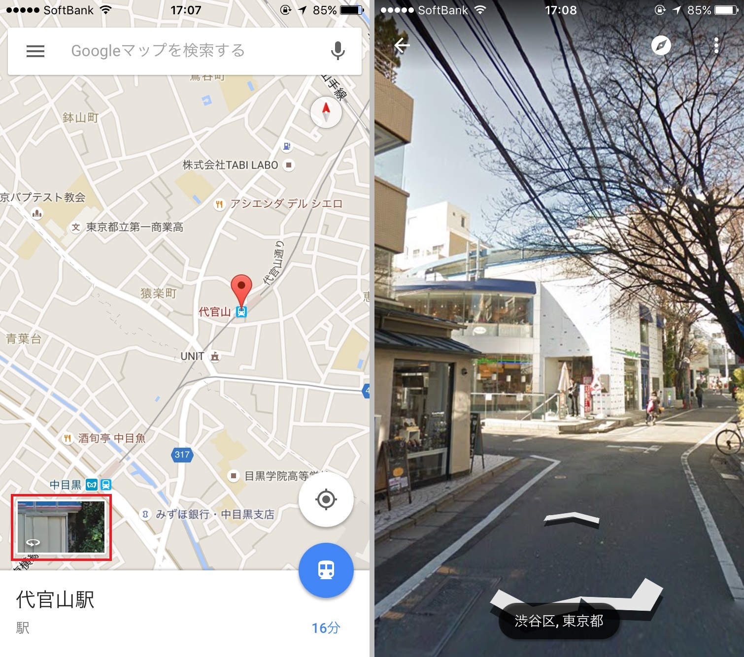 ブラウザ版でも利用できる「ストリートビュー」は、iPhoneアプリでも利用可能です。写真を見たい場所の地図を表示し、画面左下にサムネイルが表示されたら、そこはストリートビュー対応だということ。サムネイルをタップすると、その場所の360度ビューの写真を表示可能です。