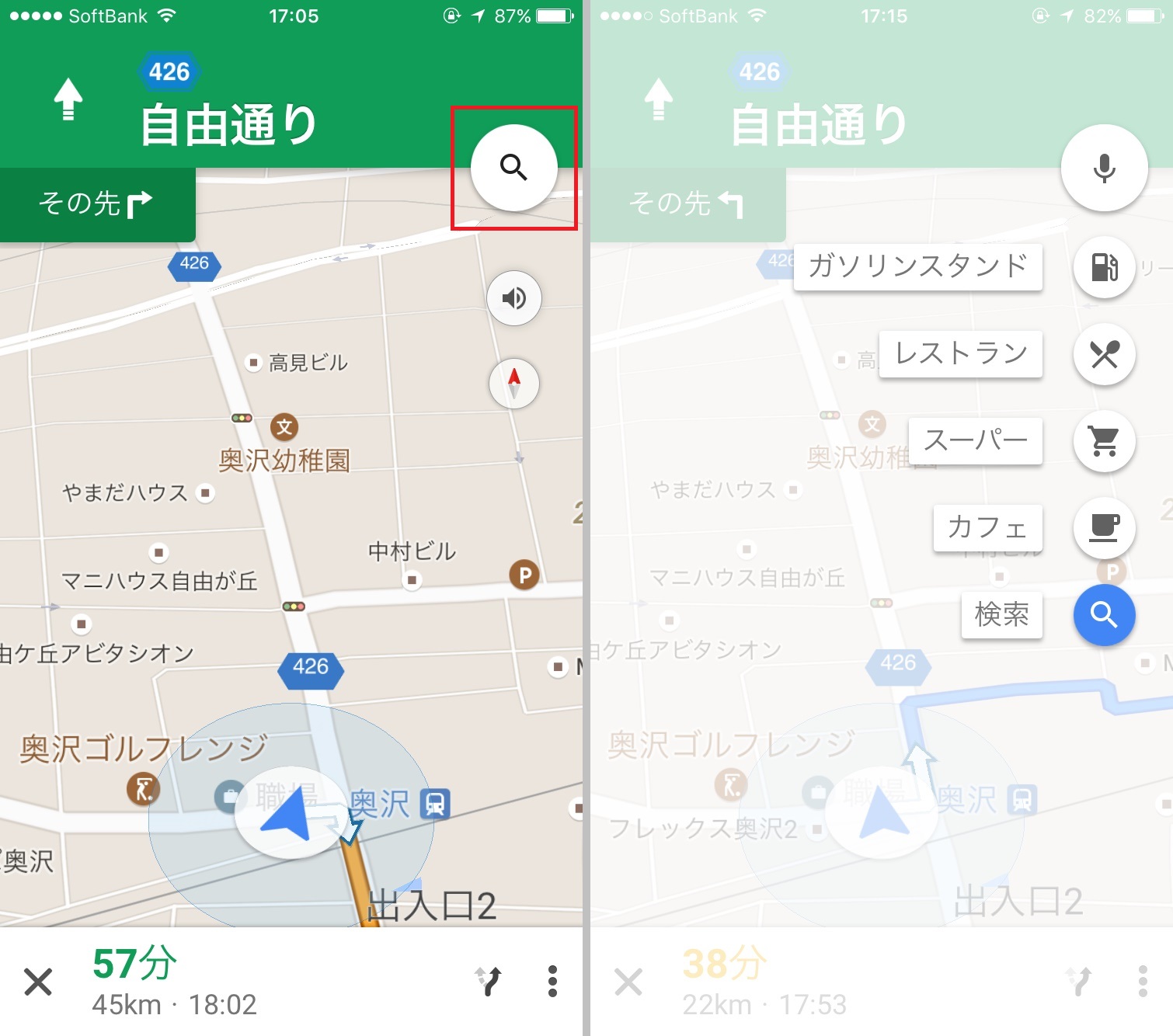 車の場合は、音声によるナビゲーションに対応しているので、iPhoneをカーナビ感覚で利用できます。また、案内中に虫めがねのアイコンをタップすると、ガソリンスタンドなど途中で立ち寄る場所を経由地として設定することも可能です。古いカーナビを使っている人はGoogle Mapsを使ったほうが最新の地図データでのナビが使えるので便利ですね。
