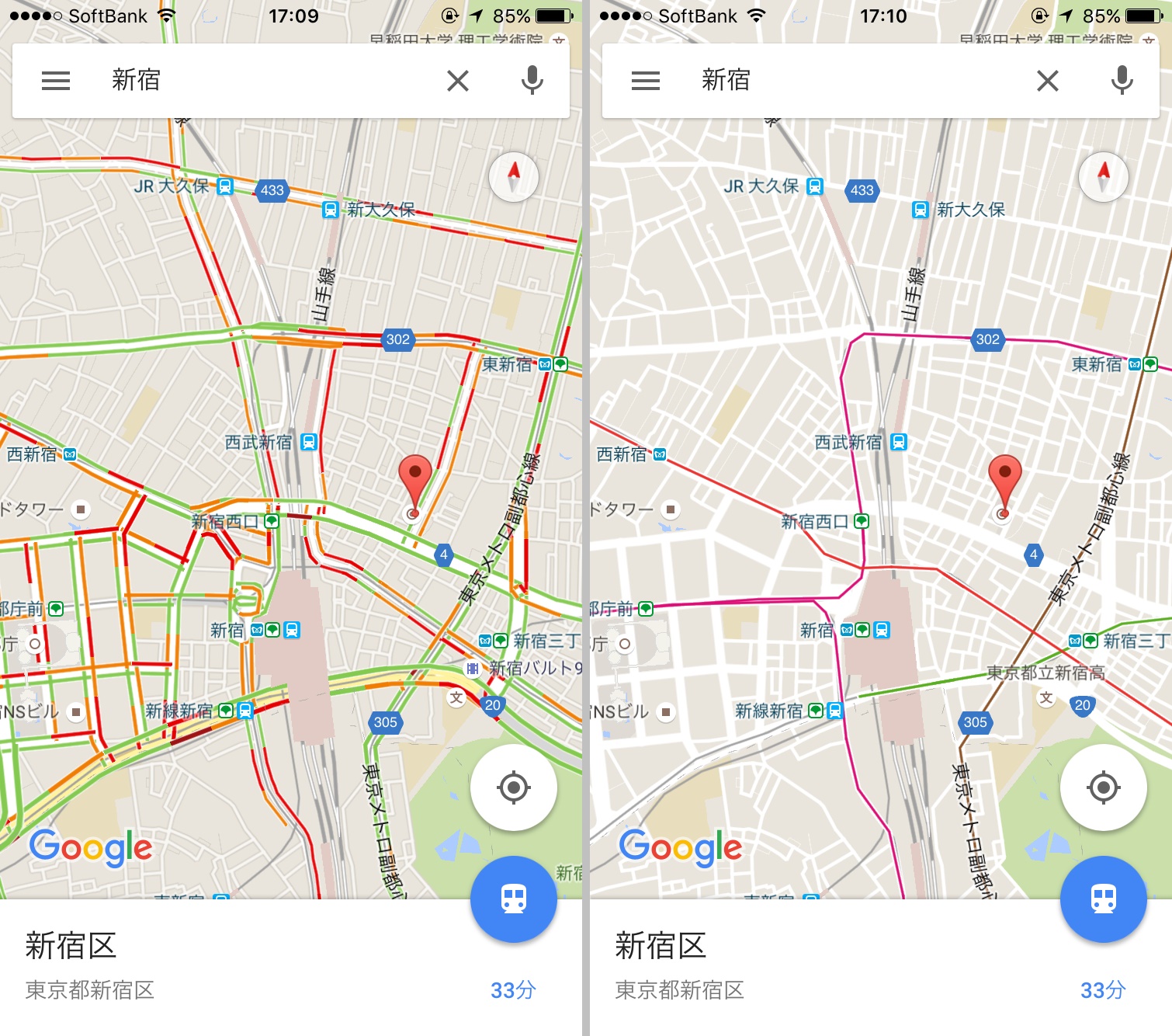 地図表示方法を「交通状況」にすれば、地図上で渋滞情報を確認できます。「路線図」に切り替えることもできるので、電車を利用するときだけでなく、駅の近くで同乗者を降ろしたいときなどに活用できそうです。地図の表示を切り替えるには、トップ画面で左上のメニューアイコンをタップし、表示したい地図を選択します。