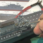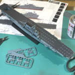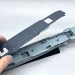 前回製作した船体に飛行甲板や対空機銃といった艤装パーツを取り付けていきます。飛行甲板も実艦に近い色で成型されていますが、船体と同じく、よりリアルに仕上げるため塗装(Mr.カラー14番ネイビーブル)をします。