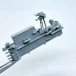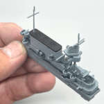 船体同様にほぼ組み上げて、缶スプレーのヘイズグレーで塗装(煙突上部のみつや消し黒)。乾燥後にデッキ部分を筆塗りで甲板色と同じネイビーブルーを塗装しておきます。艦橋に2本あるマストはABS製なので折れにくくなっているのはありがたい配慮です。