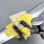 極薄のシートなのでほとんど段差もできず、メッキの質感とも違和感がありません。主翼の前縁や胴体下面は曲線で構成されていますが、フィニッシュシートは柔軟性があるのでピタリとパーツに馴染んで継ぎ目を隠してくれます。