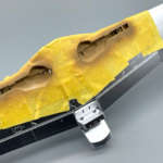塗装でナチュラルメタルな質感を再現できるのは分かっていただけたと思いますが、フィニッシュシートでも同様にトーンの違いを再現できます。今回使用したチタンフィニッシュはやや黄色みがかった艶消しの銀色です。これをパネル単位で貼ることで、メッキの塗装にコントラストをつけられます。