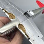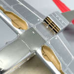 キットのメッキは無塗装(ナチュラルメタル)の質感を再現したものですが、実機は機体の部位によって同じ銀でも材質等の違いで微妙に色味が異なります。特に主翼の補助翼は羽布張り(金属のフレームに布地が貼ってある構造)の上から銀で塗装されているので、質感が大きく異なります。