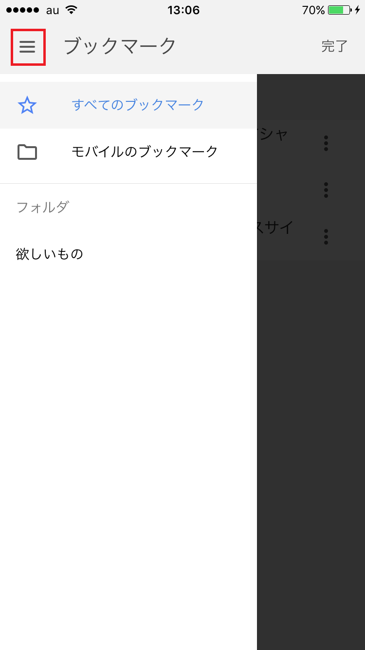 ブックマークのフォルダを参照するには、画面左上の「メニュー」アイコンをタップします。