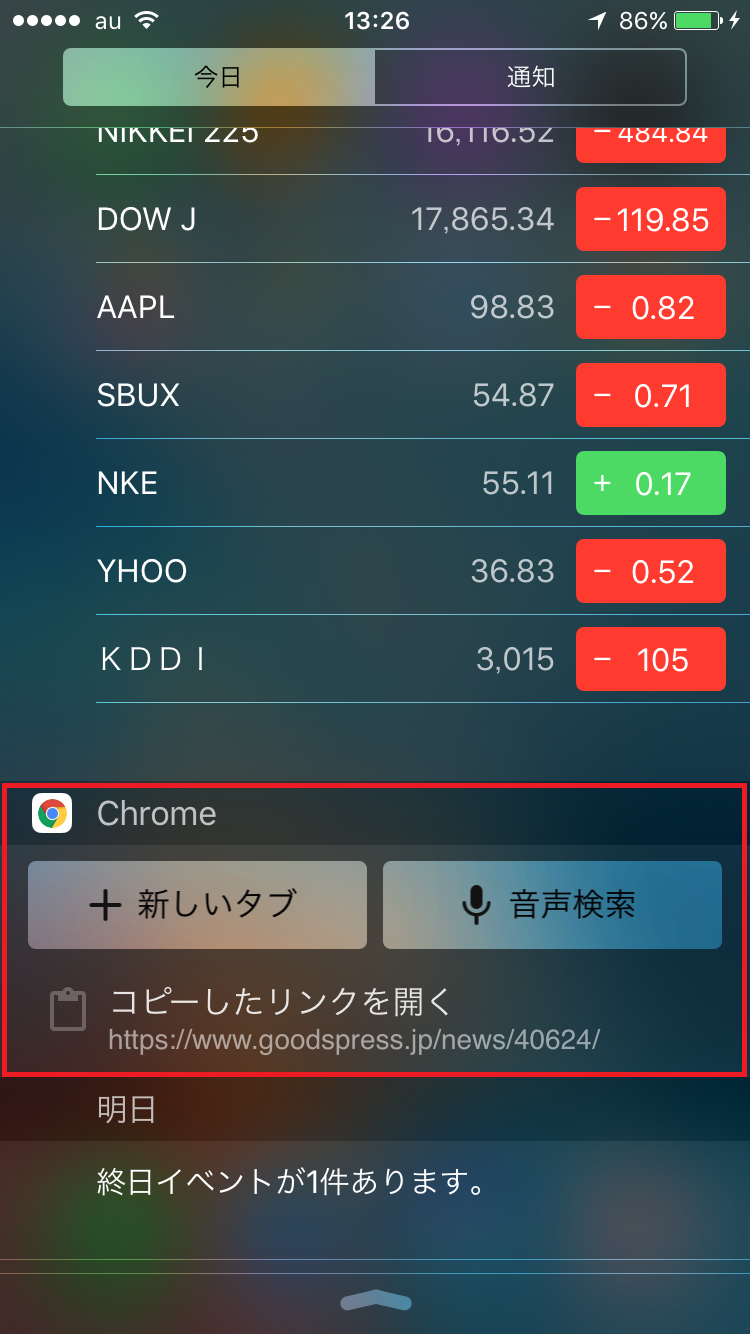Chrromeアプリは、iPhoneの「ウィジェット機能」に対応しています。ウィジェットとは、アプリを起動せずに最新情報を確認できたり、すばやくアプリを起動できる機能のこと。iPhoneの場合は、画面上部を下方向にスワイプすると表示される「通知センター」にウィジェットが表示されます。