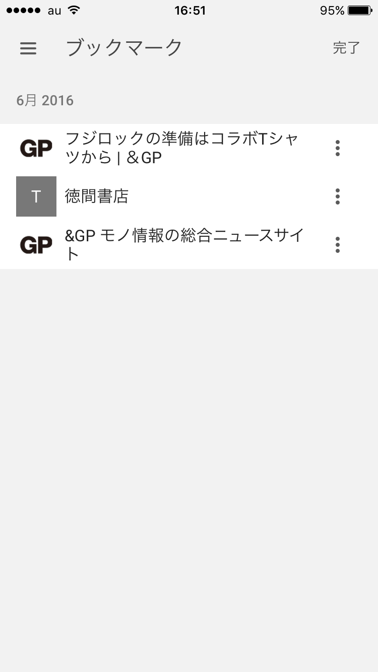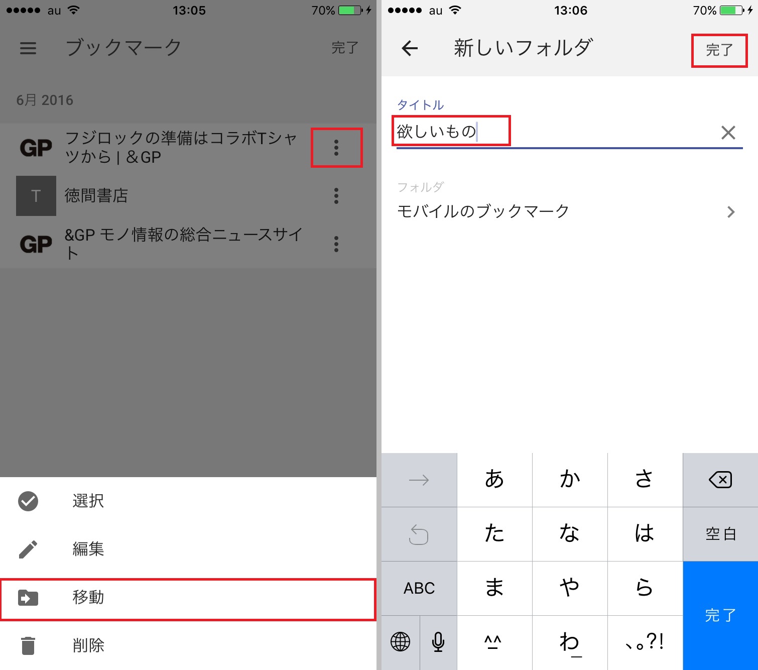 また、お気に入りに登録したページはフォルダ分けすることもできます。初期状態では「モバイルのブックマーク」というフォルダに保存される仕様で、移動したいウェブページのメニューアイコンをタップし、「移動」→「新しいフォルダ」に順に進み、フォルダ名を入力します。「完了」をタップすれば、フォルダの移動は完了。