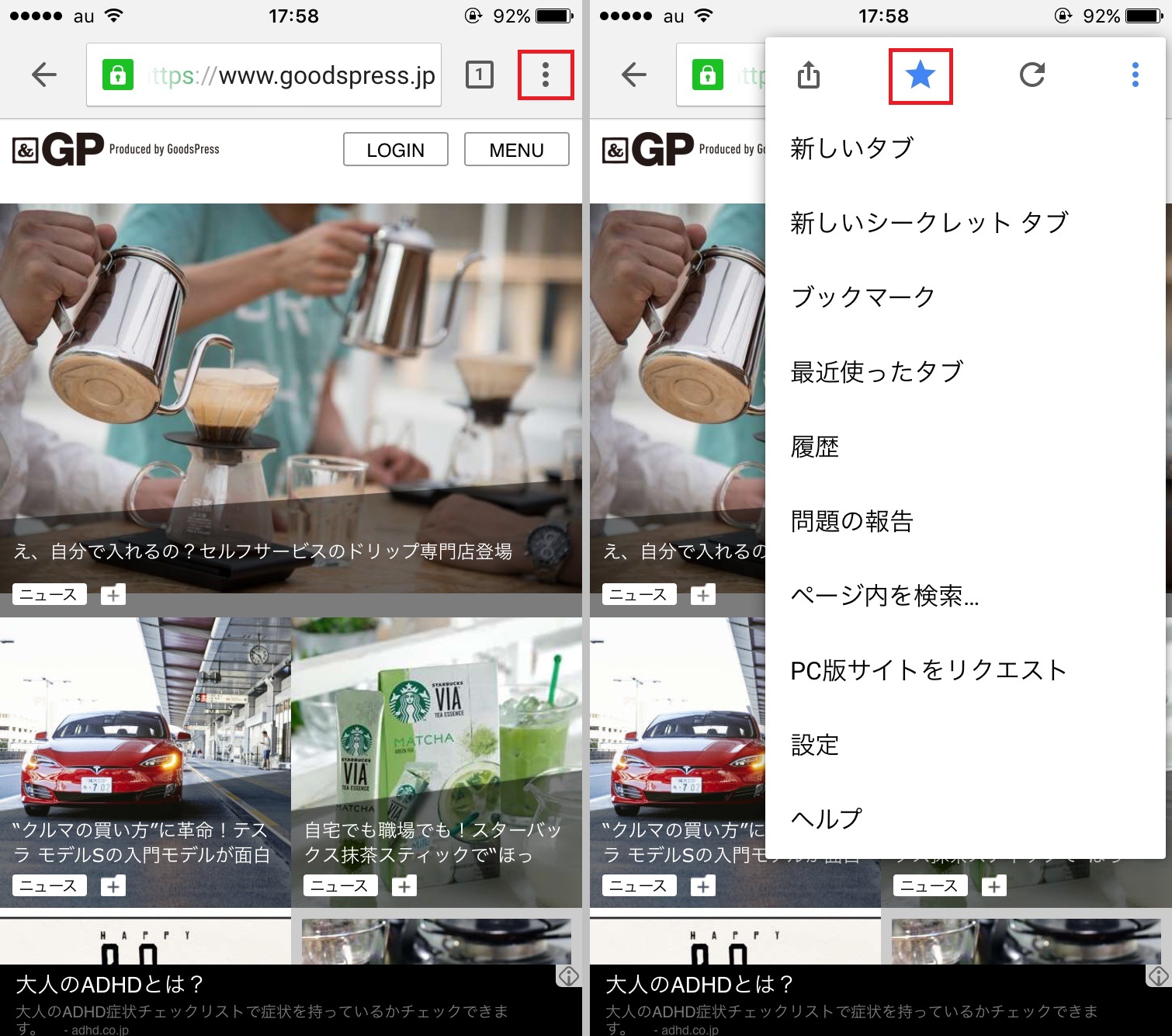 お気に入りに登録するには、登録したいページを表示した状態で、画面右上の「メニュー」アイコンをタップします。続いて、画面上部の「☆」をタップすれば、登録は完了です。