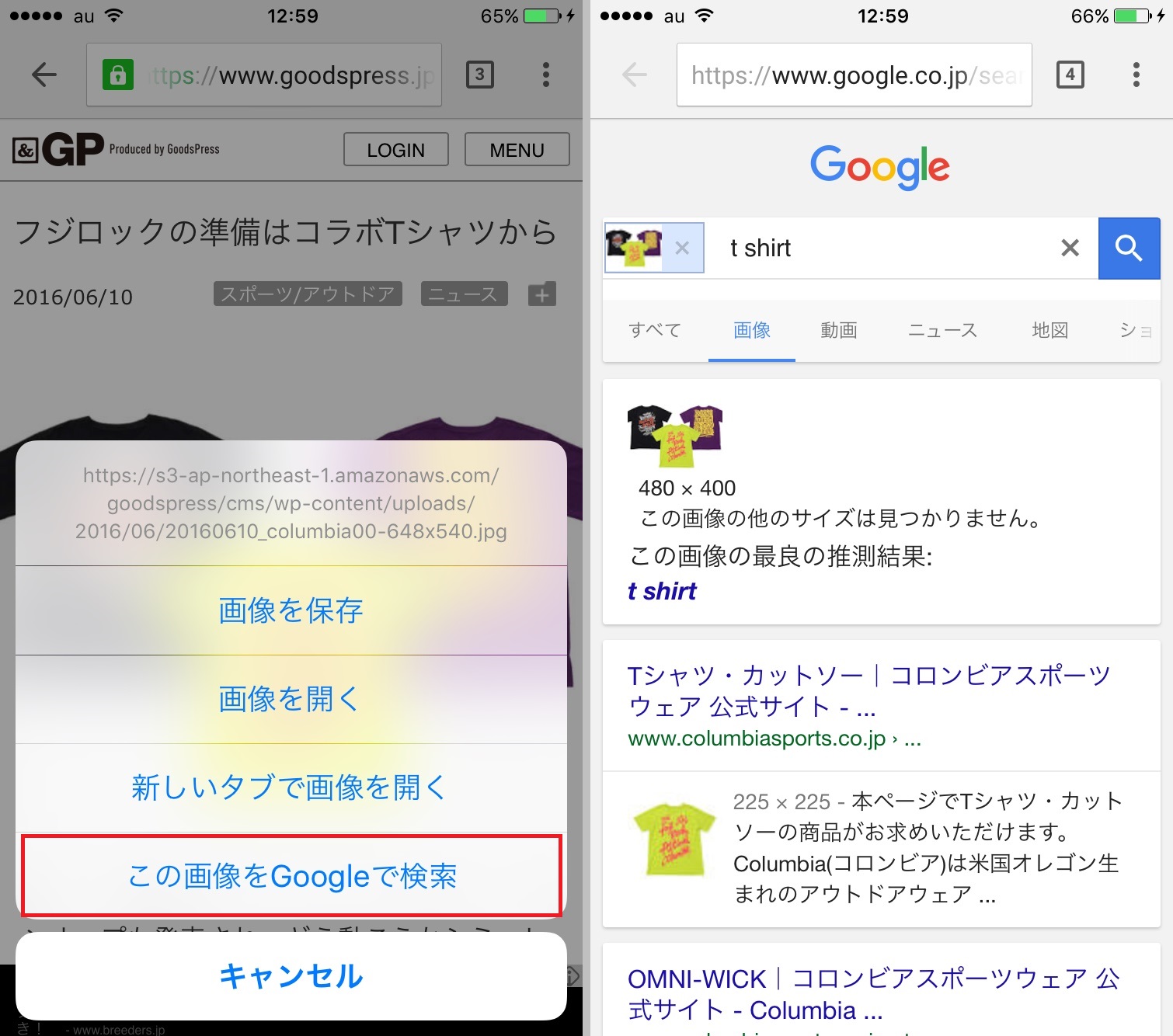 ウェブページ上の画像を保存する際に、画像をロングタップするのはSafariもChromeも同じ。Chromeの場合は、さらにウェブページ上の画像を使った「Google画像検索」にも対応しています。