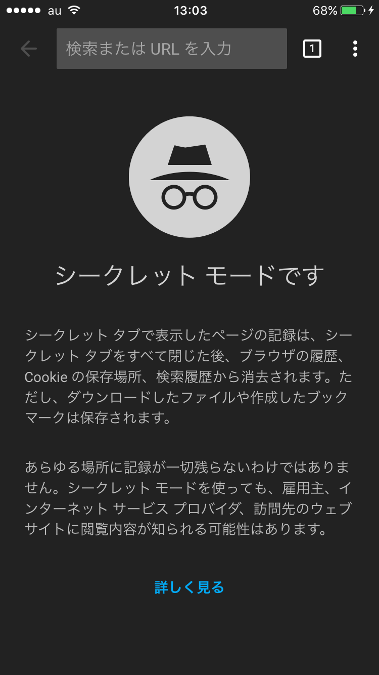 シークレットタブを開くには、「メニュー」アイコン→「新しいシークレットタブ」の順に進みます。シークレットタブの場合は、画面上部に表示されるURL欄などがグレーで表示されるのが特徴です。