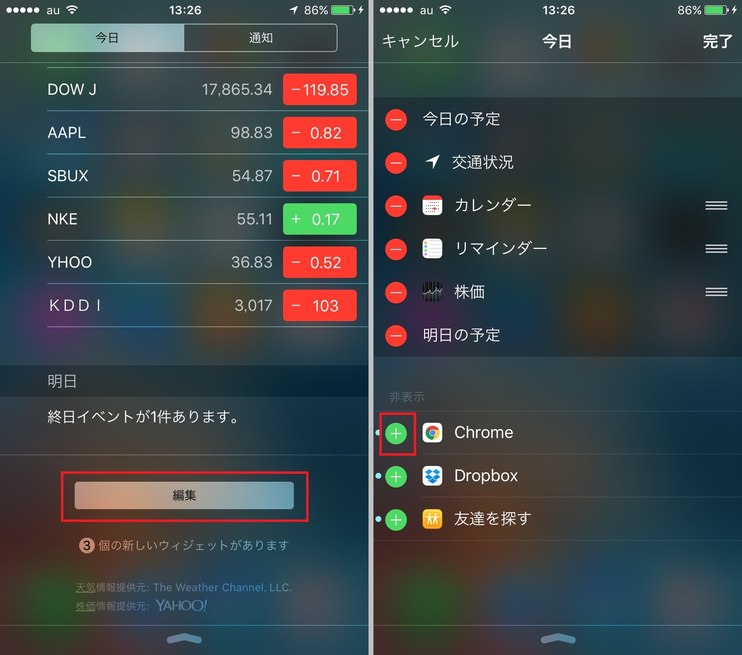Chromeのウィジェットでは、新しいタブの表示、音声検索、コピーしたリンクの表示が可能です。通知センターにウィジェットを表示するには、通知センターの「今日」タブを開き、画面下部の編集」をタップします。続いて、「Chrome」の「+」をタップしましょう。