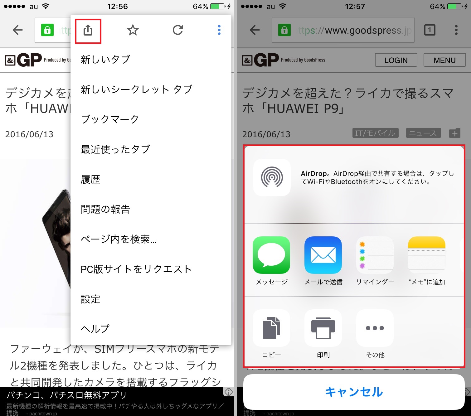 「メニュー」アイコンをタップし、画面上部の「共有」アイコンをタップすると、共有メニューが表示されます。閲覧中の記事をすばやくSNSやメールでシェアできるので便利です。