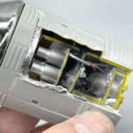 支援船内部は、真空中の太陽光線の輻射熱などから機器を保護するために耐熱シートが多く使われているので、家庭用アルミホイルをシワシワにして貼り付けることで、断熱シートの金属感を再現、爆発して吹き吹き飛ばされた部分にもちぎれたイメージでアルミホイルを使用します。プラ素材との接着には瞬間接着剤を使います。