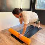 プランクとは、うつ伏せで前腕、ヒジ、つま先のみを地面につけて姿勢を保つトレーニング。これをストレッチポールを使って行い、さらに肩をタッチする動きをつけて、体幹をアップしていきましょう。