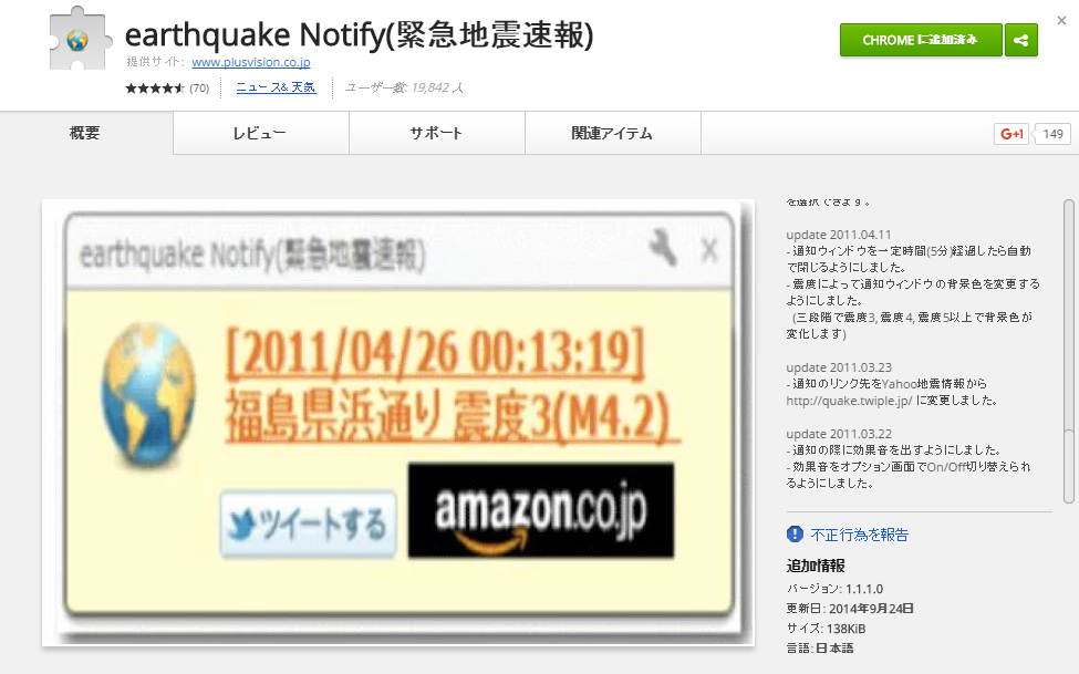 スマホには地震を知らせる機能やアプリがありますが、仕事中にはスマホを手元に置けない場面も発生します。そんなときに国内の地震情報をさりげなく確認できるのが「earthquake Notify」です。