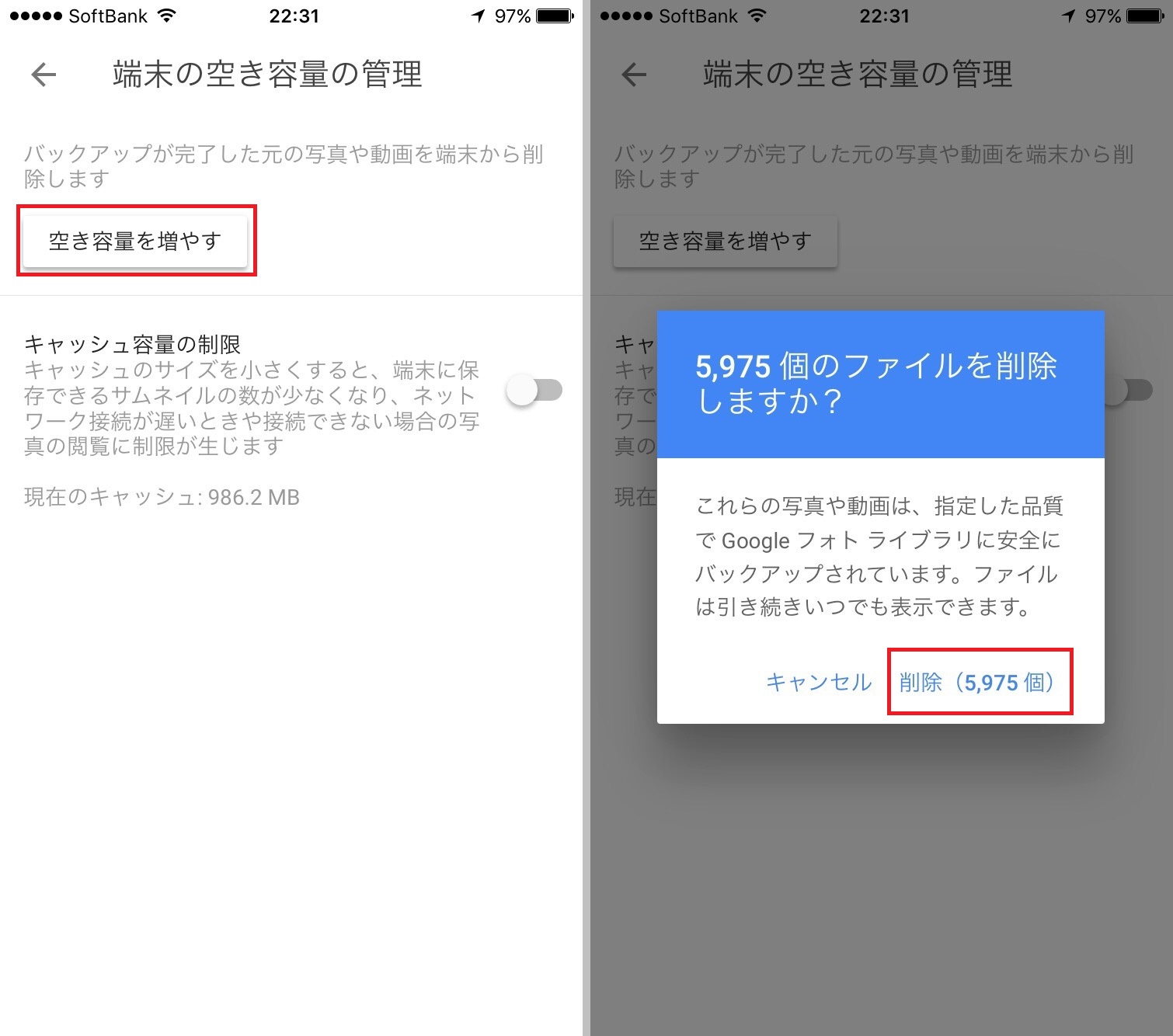 一見すると厄介な機能ですが、便利な一面もあります。それは、バックアップ後の端末内の写真を確認して削除できることです。「設定」内の「端末の空き容量の管理」で「空き容量を増やすをタップすると、すでにアップロード済みの写真をチェックしてくれます。