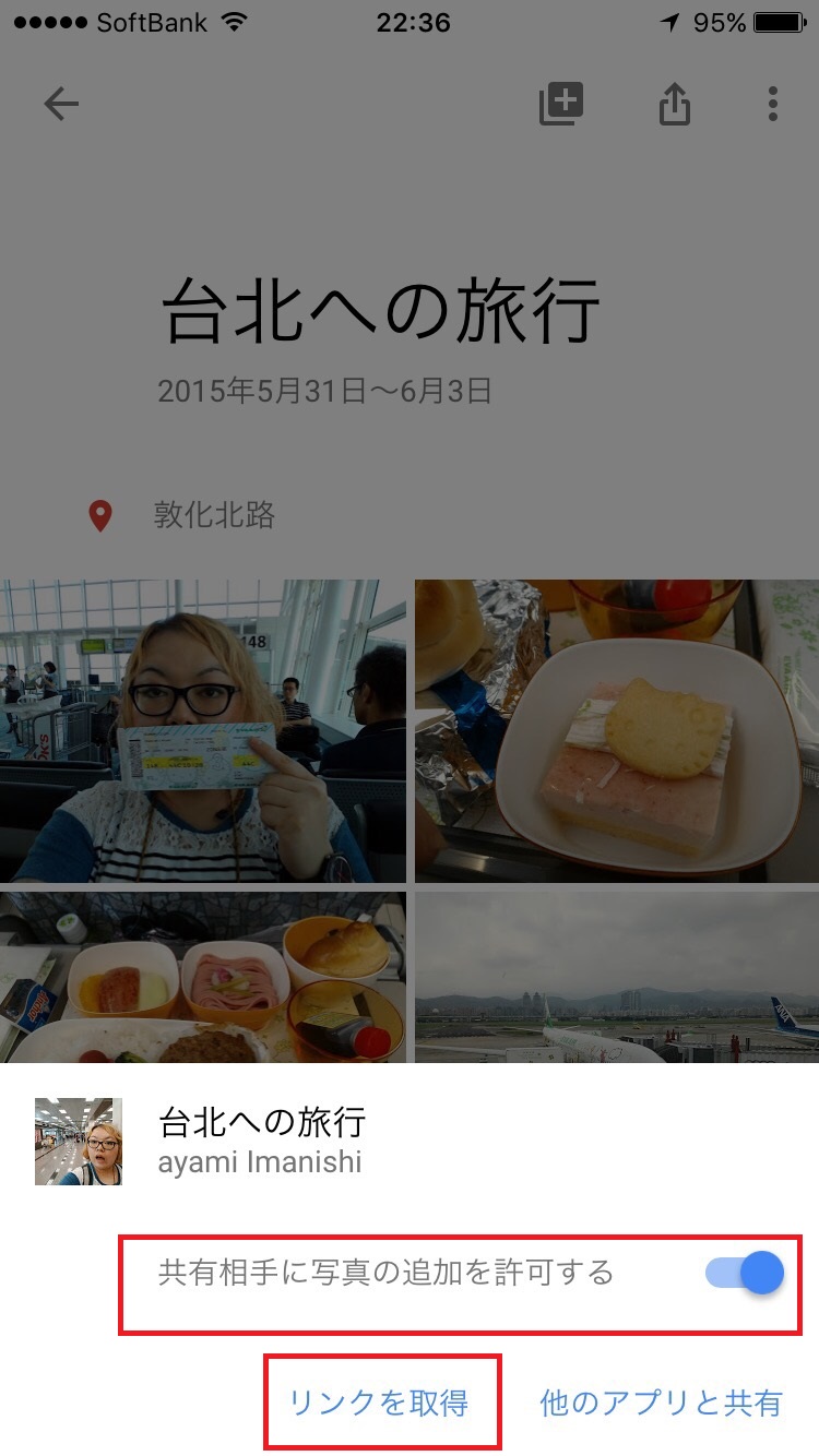 また、「共有相手に写真の追加を許可する」をオンにすれば、共有相手がアルバム内に写真を追加できるようになります。みんなでひとつのアルバムに写真をまとめたいときに便利ですね。