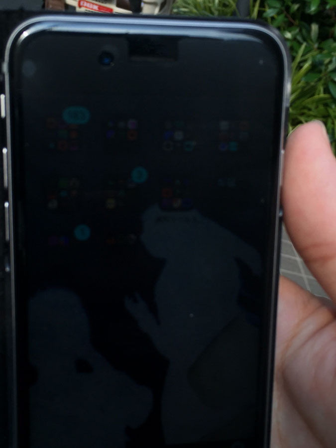 画面上の設定を変えることで、見え方を調整することはできないか? と、いろいろ探してみたところ、画面の色を反転できる設定がありました。ネガポジ反転というヤツですね。iPhoneだと「設定→一般→アクセシビリティ→色を反転」で、スライドスイッチで反転できます。しかし、うーん…、あまり改善されたとは思えず、見づらくなっただけという説も…(写真4)。ちなみに、1の反射を抑えるフィルムとの合わせ技も試してみましたが、こちらも撃沈(写真5)。