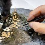 ▲チムニー周辺に、粘土で製作した二枚貝シマイシロウリガイとチューブワームを配していく