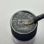 ▲塗料のフタでドライブラシの理屈を説明。凸で刻まれた文字のエッジ部分に塗料が付くことで文字がより見やすくなってくる。筆は穂先を使うと凹部分にも塗料が付いてしまうので、腹の部分を使いゴシゴシ擦りつけるように塗料を乗せていくのがコツだ