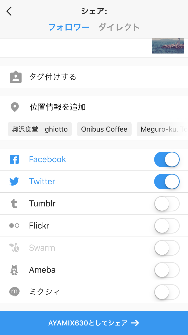 インスタグラムでは写真と一緒に位置情報を投稿できます。