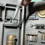パネルラインへのスミ入れと密度感をアップさせるため、リアルタッチマーカーを使って綿棒でグラデーションを入れ、さらにTB-5号とドッキングした際の乗降ハッチなど、キットで再現されていない外板をそれらしく描きこんでいます。